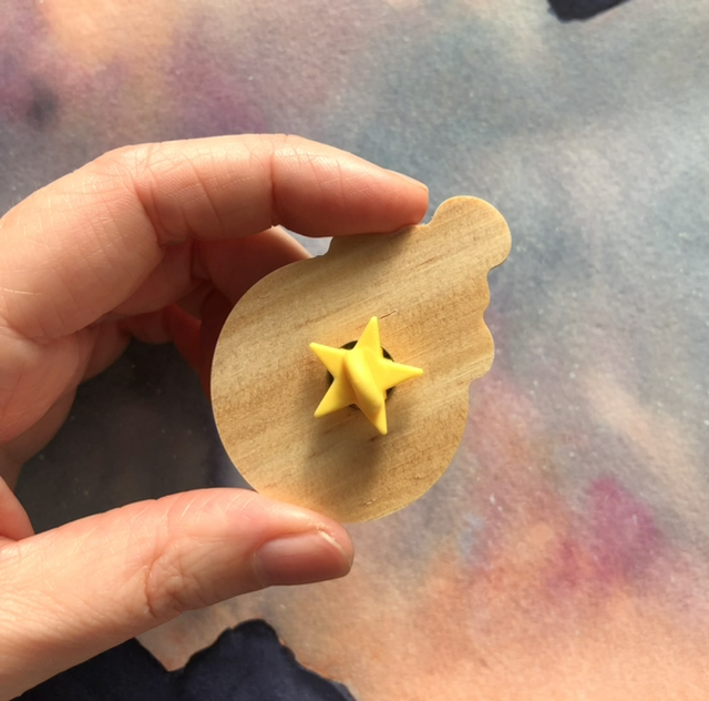 Wooden pin with image printed on the front. Single clutch. About 5cm high and 5cm wide.
