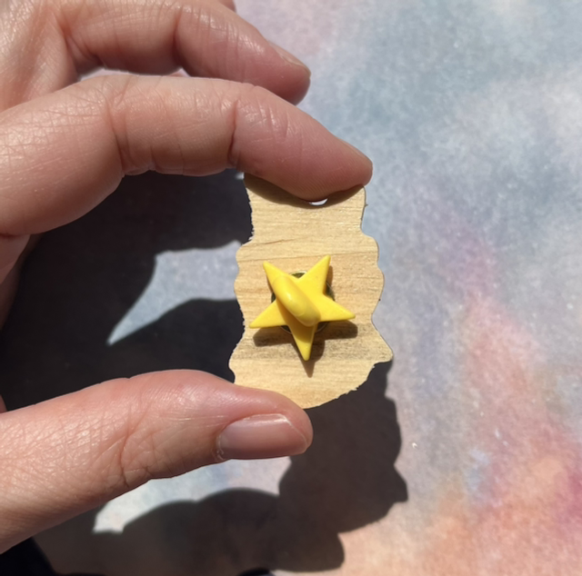 Wooden pin with image printed on top. Single clutch.
